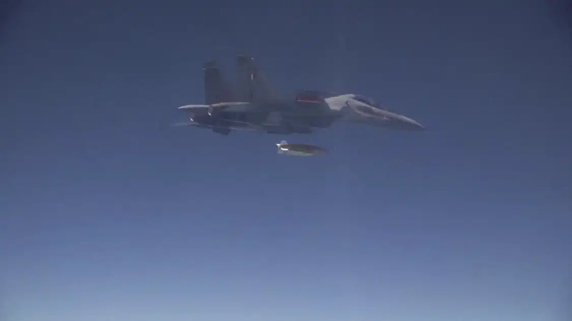 11 अप्रैल 2025 को पीआईबी द्वारा जारी तस्वीर में रक्षा अनुसंधान और विकास संगठन (डीआरडीओ) द्वारा किए गए लंबी दूरी के ग्लाइड बम ‘गौरव’ के सफल रिलीज ट्रायल के दौरान Su-30MKI फाइटर जेट. (फोटो: PTI)