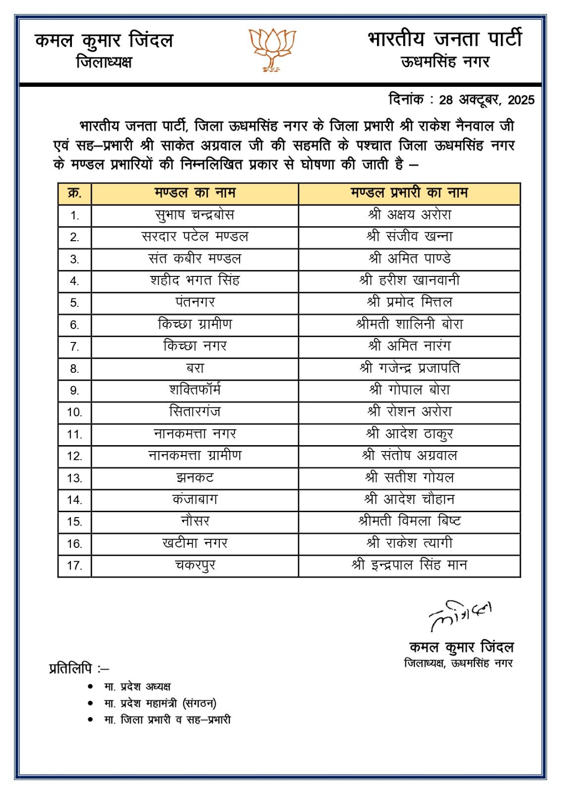 28 अक्टूबर 2025 का दिन भारतीय जनता पार्टी, ऊधमसिंह नगर के इतिहास में संगठनात्मक दृष्टि से एक महत्वपूर्ण दिन बनकर दर्ज हुआ। जिलाध्यक्ष श्री कमल कुमार जिंदल द्वारा घोषित नई मंडल प्रभारी सूची ने यह स्पष्ट संदेश दिया है कि भाजपा अपने मूल मंत्र “संगठन ही शक्ति है” को धरातल पर साकार कर रही है।