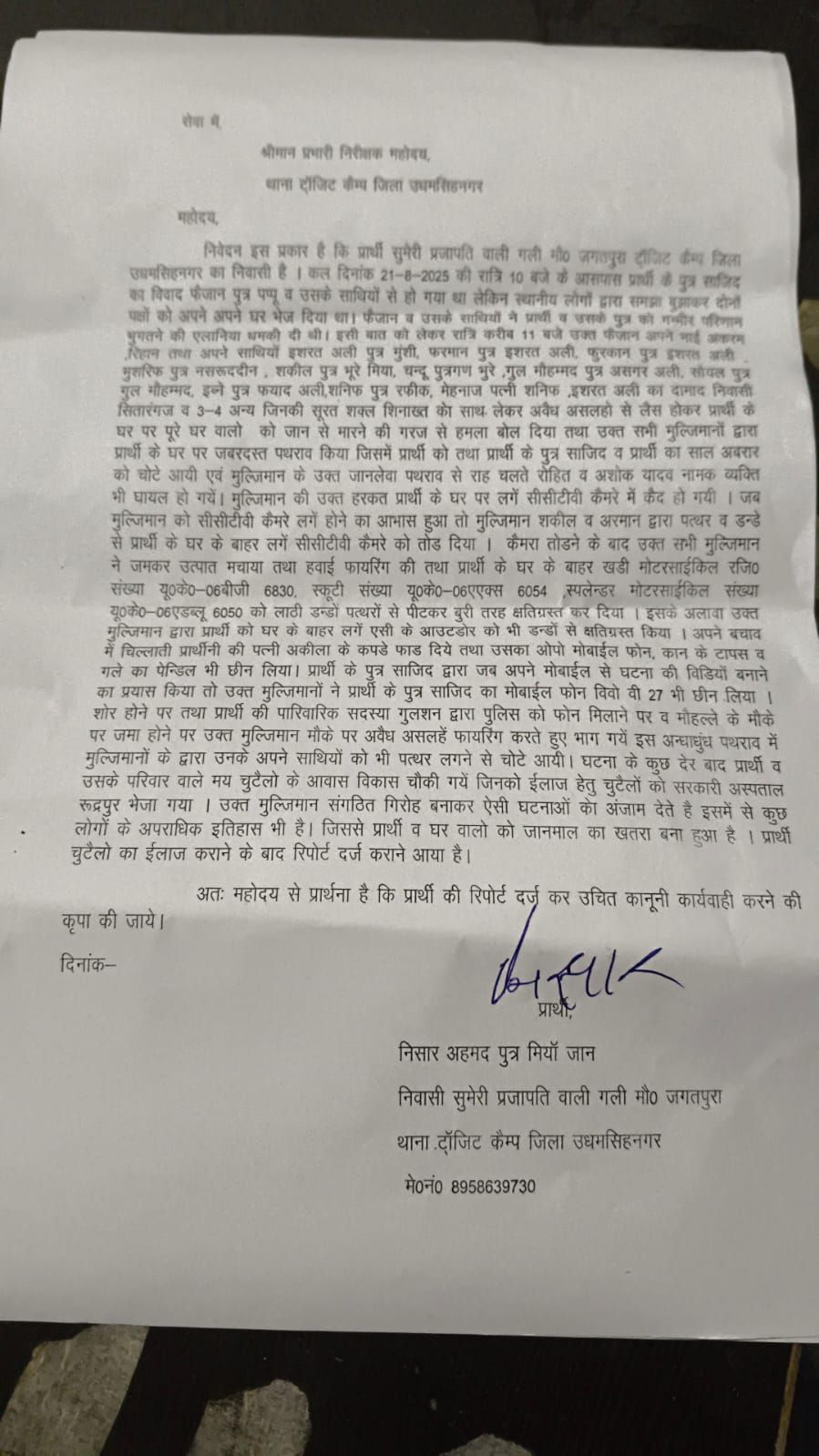 प्राप्त जानकारी के अनुसार, जगतपुरा निवासी निसार अहमद ने थाना डॉजिट कैंप में तहरीर देकर बताया कि शनिवार रात लगभग 10 बजे उसके पुत्र साजिद का विवाद मोहल्ले के फैजान व साथियों से हुआ था। हालांकि, स्थानीय लोगों ने बीच-बचाव कर मामला शांत करा दिया। लेकिन देर रात लगभग 11 बजे फैजान व उसके समर्थक अकरम हान, इशरत अली, फरमान, फुरकान, शकील, चन्दू, गुल मोहम्मद, सोयल, शनिफ, मेहनाज, इशरत अली का दामाद निवासी सितारगंज समेत 3–4 अन्य लोग अवैध हथियारों से लैस होकर उनके घर पर हमला करने पहुंच गए।