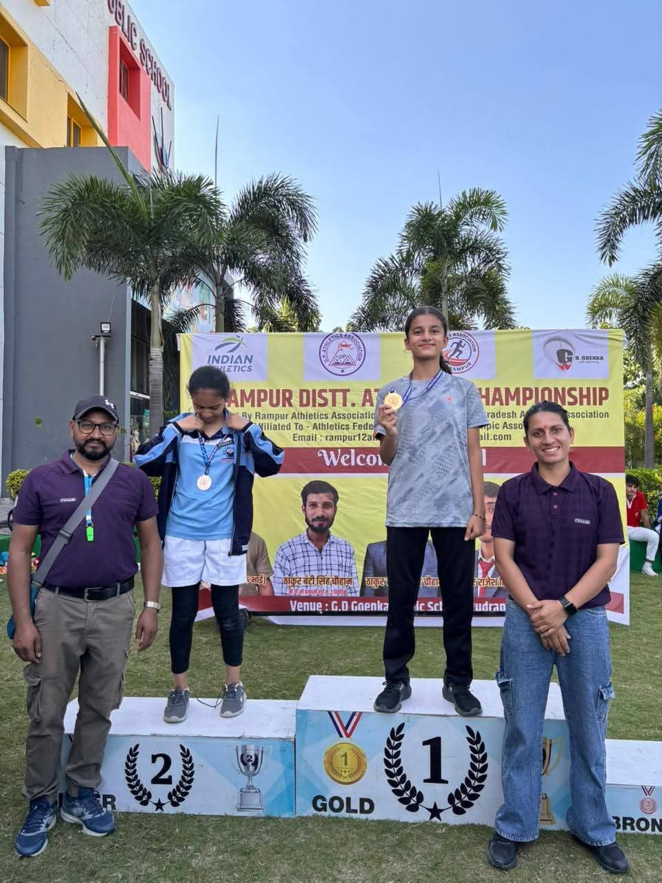 रामपुर। रामपुर एथलेटिक्स एसोसिएशन के तत्वावधान में एक दिवसीय एथलेटिक्स चैम्पियनशिप का भव्य आयोजन जी.डी. गोयनका पब्लिक स्कूल, बिलासपुर, रामपुर में किया गया, जिसमें 15 से अधिक विद्यालयों के खिलाड़ियों ने भाग लेकर अपनी प्रतिभा का प्रदर्शन किया। इस प्रतियोगिता का शुभारंभ मुख्य अतिथि श्री कुलवंत सिंह औलख (ब्लॉक प्रमुख बिलासपुर), विशिष्ट अतिथि घनश्याम श्यामपुरिया (उपाध्यक्ष, बॉक्सिंग एसोसिएशन उत्तराखंड), श्री अतुल गोयल (चेयरमैन जी.डी. गोयनका स्कूल बिलासपुर), गुरप्रीत सिंह पन्नू एवं दलजीत सिंह द्वारा किया गया।