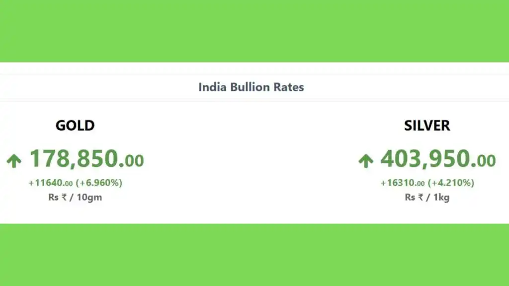 बुलियन वेबसाइट के मुताबिक 29 जनवरी को सोना 11640 रुपये महंगा होकर 178,850 रुपये प्रति 10 ग्राम पर पहुंच गया. जबकि चांदी की कीमतों ने 16310 रुपये की जबरदस्‍त छलांग लगाई, जिससे ये उछलकर 403,950 रुपये प्रति किलो पर जा पहुंची.