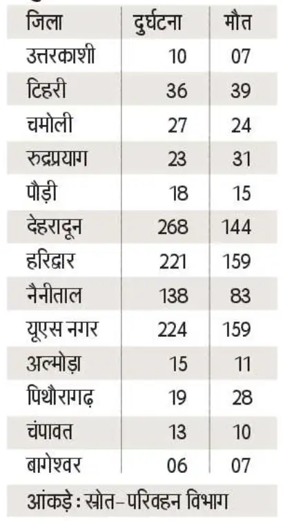 यह आंकड़ा लगातार बढ़ रहा है। प्रति सौ दुर्घटनाओं में मौत के मामले में उत्तराखंड छठे स्थान पर है। इस सूची में नागालैंड पहले, बिहार दूसरे और तीसरे स्थान पर झारखंड है। चौथे स्थान पर पंजाब और पांचवें स्थान पर मेघालय है। केंद्र सरकार के इलेक्ट्रानिक डिटेल्ड एक्सीडेंट रिपोर्ट (ई-डीएआर) में इसका जिक्र किया गया है।